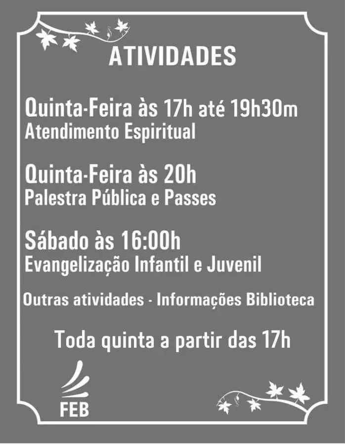 20h às 21h - Palestra Pública de explanação do Evangelho seguido de Passes